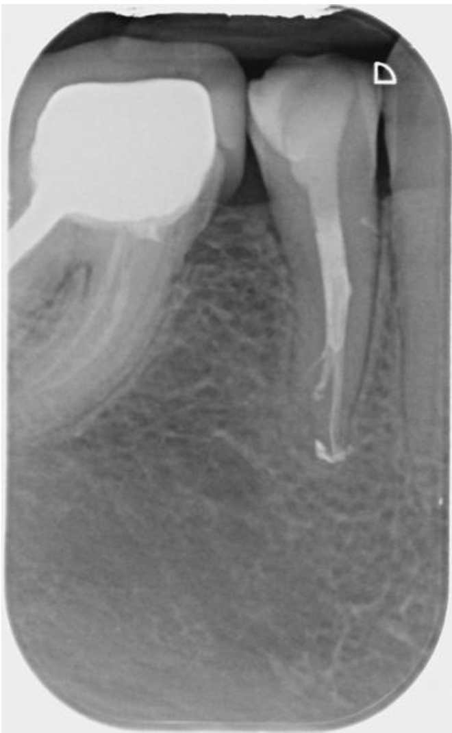 All irrigants were activated using passive ultrasonic irrigation (PUI) with Eighteeth’s Ultra X. It was then filled using a combination of warm vertical compaction (WVC) and AH+ resin-based sealer. 3M’s Filtek’s bulk one resin was used as a nayyar core. This lovely lady was then returned to her RD to provide cuspal coverage.